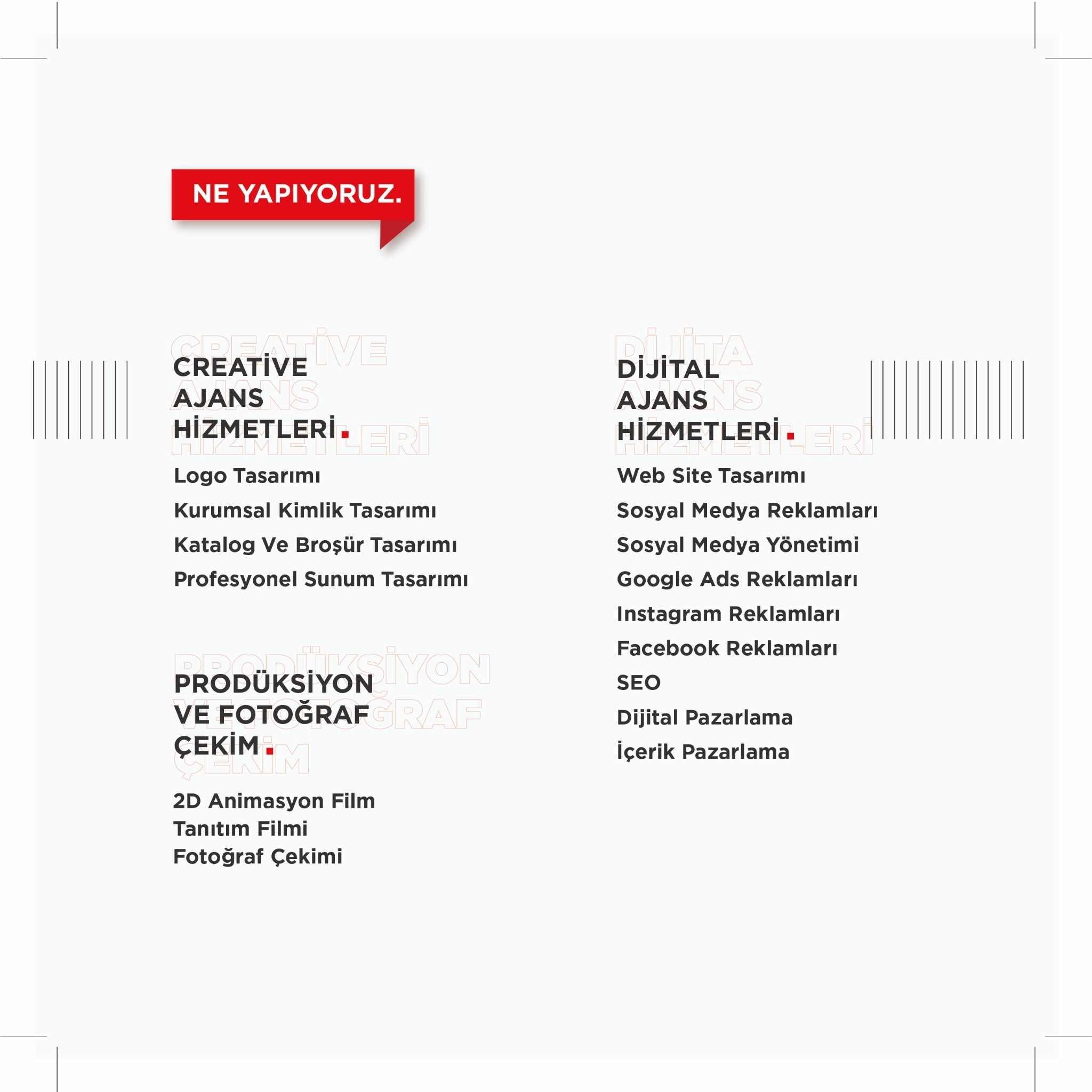 Biz sadece tasarlamayız. Anları görünür kılar, fikirleri duyulur hale getirir, markalara karakter kazandırırız.